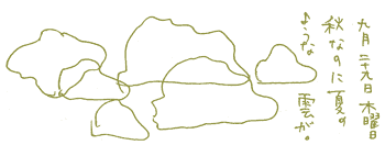 9月25日(日) 台風 郡山は午後、雨があがった。このあいだ、畑の中にある「もも」直売店のおばちゃんが言っていた。「私は埼玉から嫁に来たんだけども福島の中通りは天災もあんまり無いし、おだやかでいいところよ。」と。ほんとだ。(一)