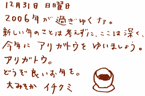 12月26日(火)あとナニを むむむ。今のこの歳末あせり..。どこかでその超巨大盤を味わった気がする.......そーだ、これだ。東京から郡山へ移住するまでの日々。私的に非常ォォに巨大なアセリだったのでした。自宅と事務所の引越しのこと、子供の学校や保育園のこと、仕事の東京の得意先への地方移転のご理解&これから仕事をいただく郡山の代理店などへの売込みの計画。あーもー時間が来ちゃうよおおおおおー、てのを帰郷の2年ぐらい前から抱えていたデスよ。んに、比べたら年の瀬ぐらいアレです。でもフシギなもので、郡山生活が馴染みはじめ、気がゆるんだとたんにアッチ痛いコッチ痛い、てなプチ病気が。「いつまでも20代のままの君と思 うなよ」と図星なことをおっしゃるお医者さん。おっさるとーり。(一)