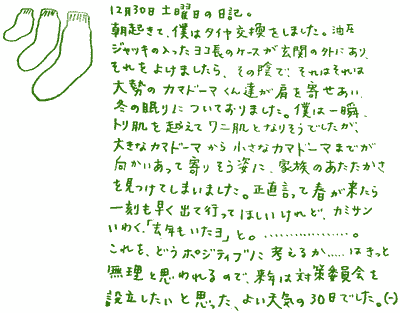 12月14日(木)よいスパイラル 世の中的にではなく、ごく私的に、今年をあらわす漢字は「支」。ささえ。去年の春、東京から郡山に来てから、思えば、おじぎをする回数がとても多くなった。譲り譲られることが多くなった。チカラを借りたり貸したりすることも多くなった。昔からの良い連鎖がちゃんと生きてるんだなー郡山。一年と少しの間に実に色んなことが実現できたのは、まぎれもなく色んな人に支えてもらったからダスよ。 .......つーか見た目がつまんないダか「支」て漢字は。(一)