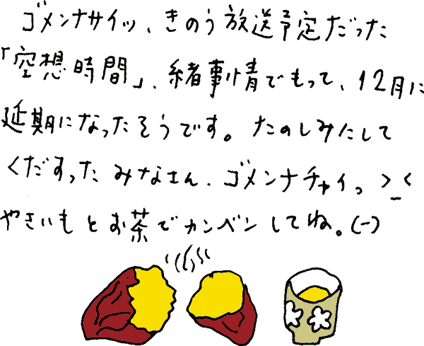 ただごとではないほどのご無沙汰してしまいホント申し訳ありませんでスたっ!!!みなさま元気で美味しいもの食べてますかっ。ぁぁぁ..あれ旨いすよねぇぇぇえ。いいなぁぁ。わたし秋の間に3キロちょい重くなり、昨秋着てたお気にのタイトなベストが着れなくなっておりまスた。つのるお話はともかくとスて、上にありますように、新しき郡山コミュニティFM79.1mhzで、プレイタイムカフェの丹治マスターが構成&パーソナリティをつとめる番組「空想時間」が始まります。第1回は明後日26日(金)夜11時から。毎月第3金曜の夜だそうですんで、昆布茶でもススりながら温かくして聴きましょうネ。(一)