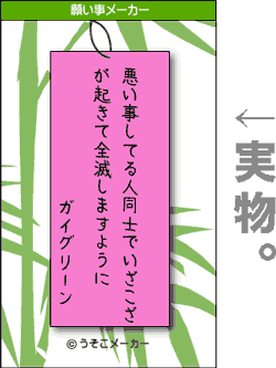 イチクミがコスチュームデザインを担当した、商店ガイレンジャー。地元郡山以外で大活躍っ!!! 郡山で頑張ってよぉぉ〜〜〜ガイレンジャぁ〜〜〜っ。ガイレンジャー正式メンバーは、ガイレッド、ガイブルー、ガイイエローの3名で、ガイグリーンは、いつかメンバーに交ざりたくて、今も修行する身。私は応援するキモチで「願い事メーカー(脳内メーカーのシリーズ)」で、ガイグリーンと入力して占ってみたのです。そしたら結果は添付の通り。なぜそんなに他力本願なんだよーっ!!!! やっつけてくれよーっ!!!!