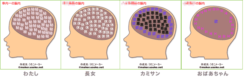 まぁぁぁぁ..なんでしょうかねぇぇ..ウチの家庭崩壊は、すぐソコじゃないでしょうか。まぁ今さらながら脳内メーカーで盛上がってる訳なんですが、あまりのサンタンたる結果にガク然としてますよ、ええ。次女だけは、まぁまぁ常識の範囲内で収まってくれたのでアイツはタクましくやってくれると思うんですが、残りの全員ですよ問題は。上の添付。まず左から、私。ぜんんんんぶ「秘」ですよ。次は長女。ぜんんんんんぶ「休」ですよ。さて最悪なのが右半分の2名。カミサン。みっっちりの「悪」を「欲」が取り囲んでますよ。最後、お婆ちゃん。1つの「欲」を大量の「H」が取り囲んでますよ。 ...ぁぁぁなんか、、色々想像したくない、、、 (一)