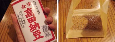 はぁぁぁ眠いス。でもって体のあっちもこっちが滞ってるので、夕ご飯前にウォーキングりますた。途中なんとなく吸い込まれるよぉにスーパーに入ってしまって、そしたら吸い込まれるよぉに美味しそうな納豆を発見してしまって、つか、納豆を包んである素材が、薄くスライスした木の皮で、そこが嬉しくてつい買ってしまいますた。会津高田納豆。この木の包み紙は、自分が5才くらいの時、よーくおつかいで肉屋さんへ豚肉の細切れを買いに行ったんですが、もちろん量り売りで、肉を木の皮に包んでくれるのがウマそうでウマそうで、ハナをたらしてジぃぃぃ〜っと見ていたのを思い出すのです。シヤワセだったなー。5才の私は豚の脂身が好きで「ニクニクしいところ、ちょーだい!!!」と叫んでいたのを思い出しますし、今では私のボディがニクニクしい具合になっています。(一)