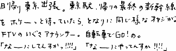 7月9日(火) ふぐすまてりび(福島テレビ)さんと、デンヤさんと、打合せ。今回の仕事はナカナカの難しさだだだ。でも負けないだ。すがす(しかし)、きょうも暑かった。みなさん平気ですたか。ぁぁぁそうでもなかったんですか。私の愛車は、もともとあんまり燃費は良くないんですが、エアコンをつけたらリッター4.3kmと、鬼のような表示が出ておりますた。(一)