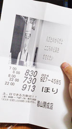 11月25日(月) 今宵の夕食は、ほっともっとの幕の内弁当「梅」。に折込まれてた、パートさん募集のチラシの写真のお姉さん、これ、ちと細長すぎやしないかぁぁぁいくらなんでも。バッタじゃないんだから。インパクトありすぎて、チラシの内容が、さっぱり入ってこない。でもって、下の方の「主婦・学生歓迎」の文字、こんだに、平(ひら)かけなくて良いだろぉぉ。なんかぜんぶ変。きっとこれ、作っててどうにもなんなくなって、これ以上やると、もっと変になる、っつって、途中でやめたんじゃなかろぉか。でも考えてみてください皆さん。お姉さんの写真が、平(ひら)じゃなくて良かったすよ。平(ひら)だったら、可愛そすぎるでしょ。カニみたいでしょう。それ見てパートさん集まらないでしょう。(一)